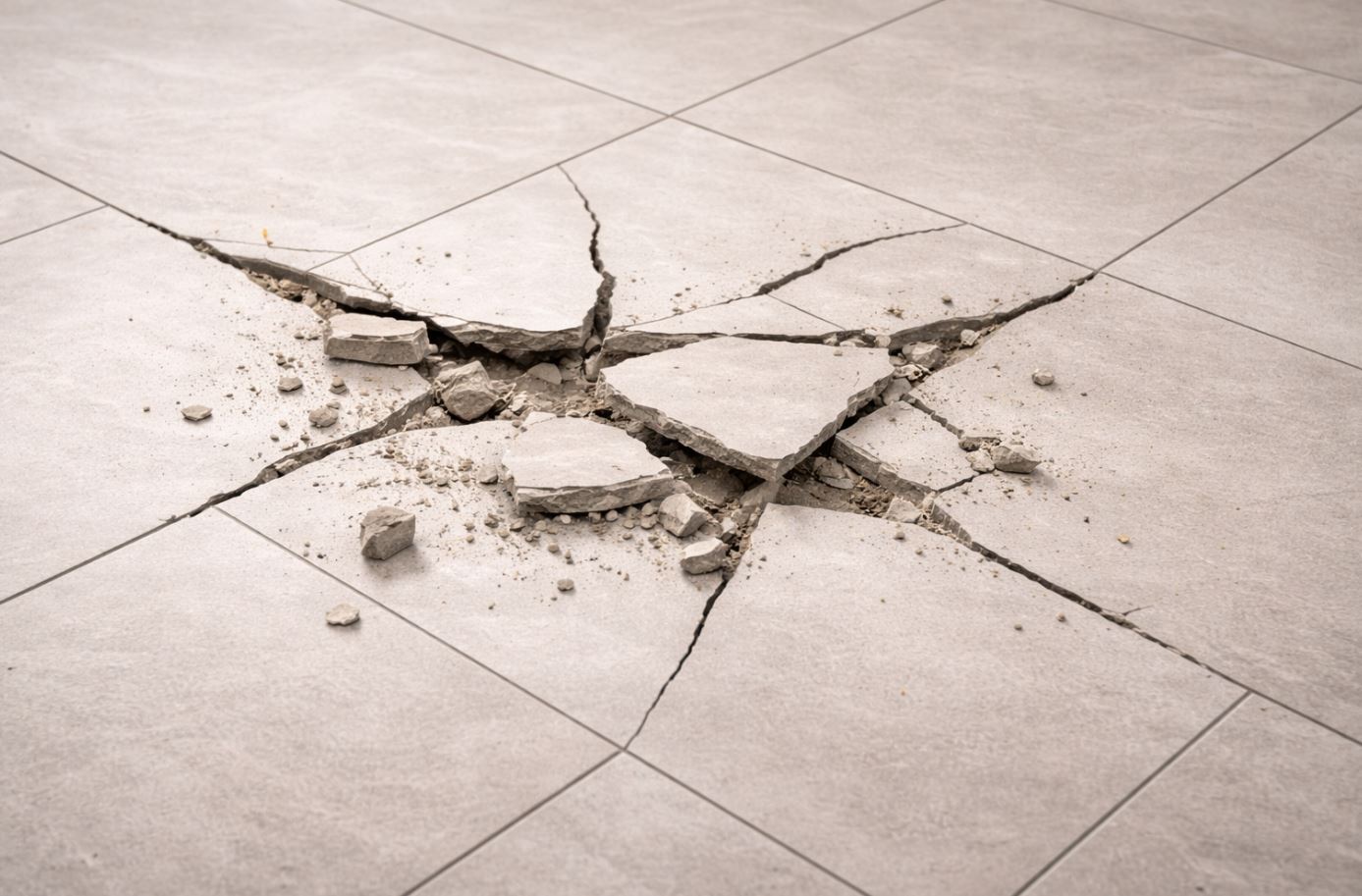 鋪貼時若背膠不完整、泥作含水、或施工未壓實,磁磚下方會形成空隙。走動或重物壓下去時,磁磚就像「懸空板」一樣容易裂,尤其常見對角裂。