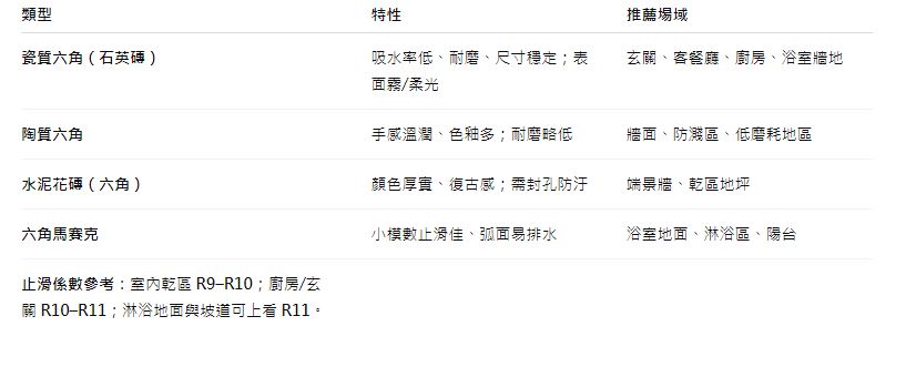 - 同色縫=整體連續;深色縫=六角輪廓更鮮明;白縫=乾淨但較顯汙,需選防汙填縫。