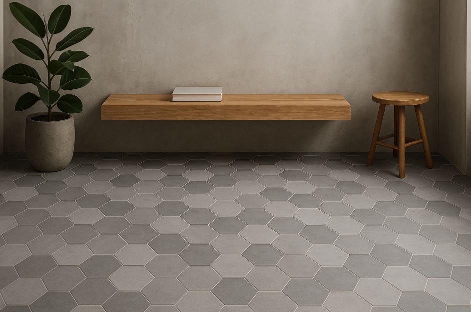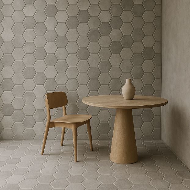 六角磚的魅力在於規律中可變化:顆粒大小、色階深淺與縫色搭配,能創造空間的節奏與分區。