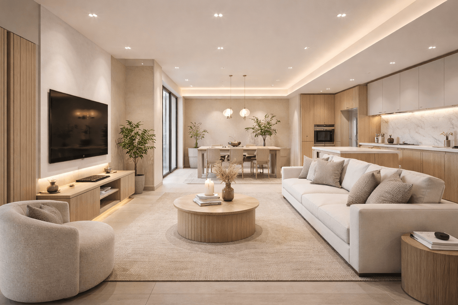 看電視、用餐、閱讀、工作、休息,對燈光的需求都不同。無主燈設計若搭配分區控制,能更靈活地依照生活情境切換。