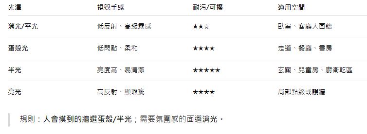 - 抗汙/抗霉:走道、兒童房、靠窗牆優先。