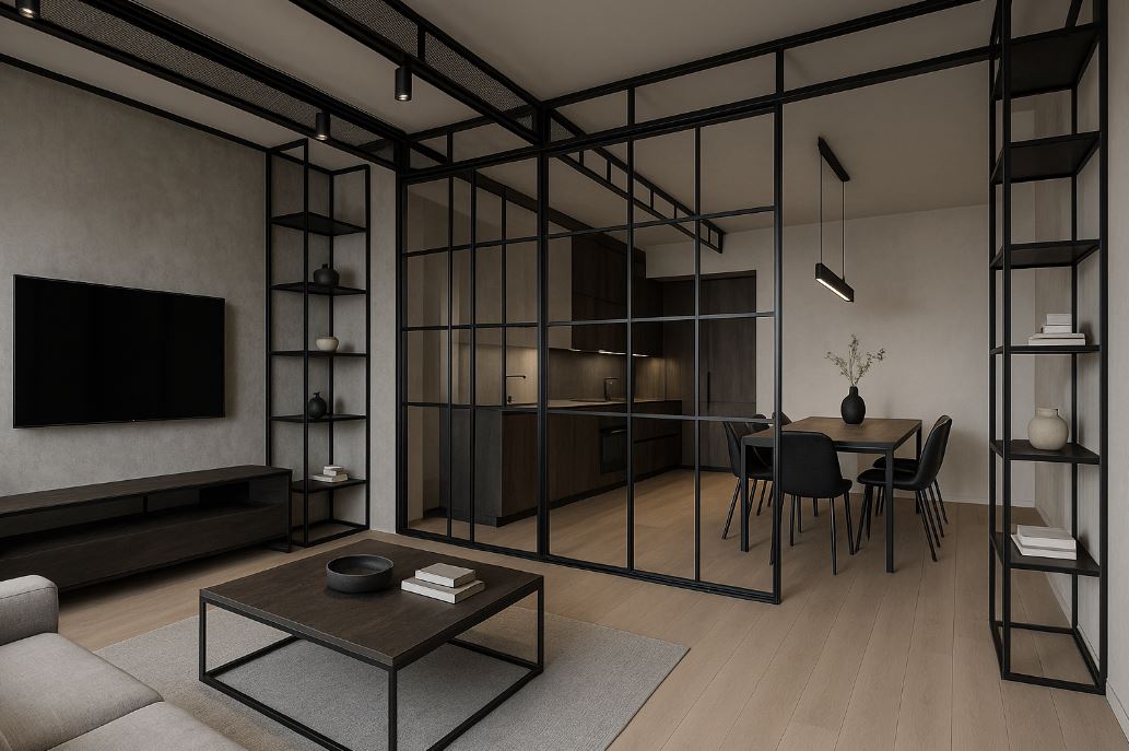 鐵材最大的優勢是薄、挺、可客製:用精準的線條框出比例,再以霧面烤漆與天然材料柔化觸感。