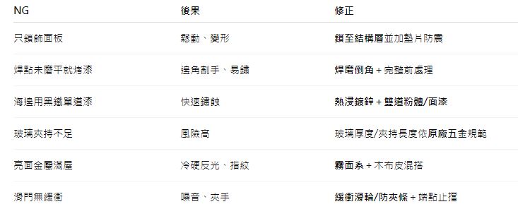 - 海風/沿海:優先不鏽鋼+粉體或熱浸鍍鋅+雙道烤漆,避一般黑鐵外露。