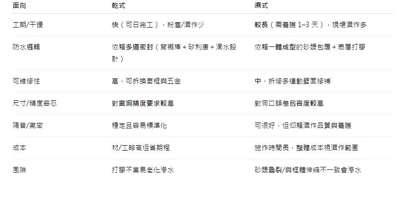 乾式、濕式各有優勢,關鍵在於外牆材質、窗洞精度、氣候與工期。