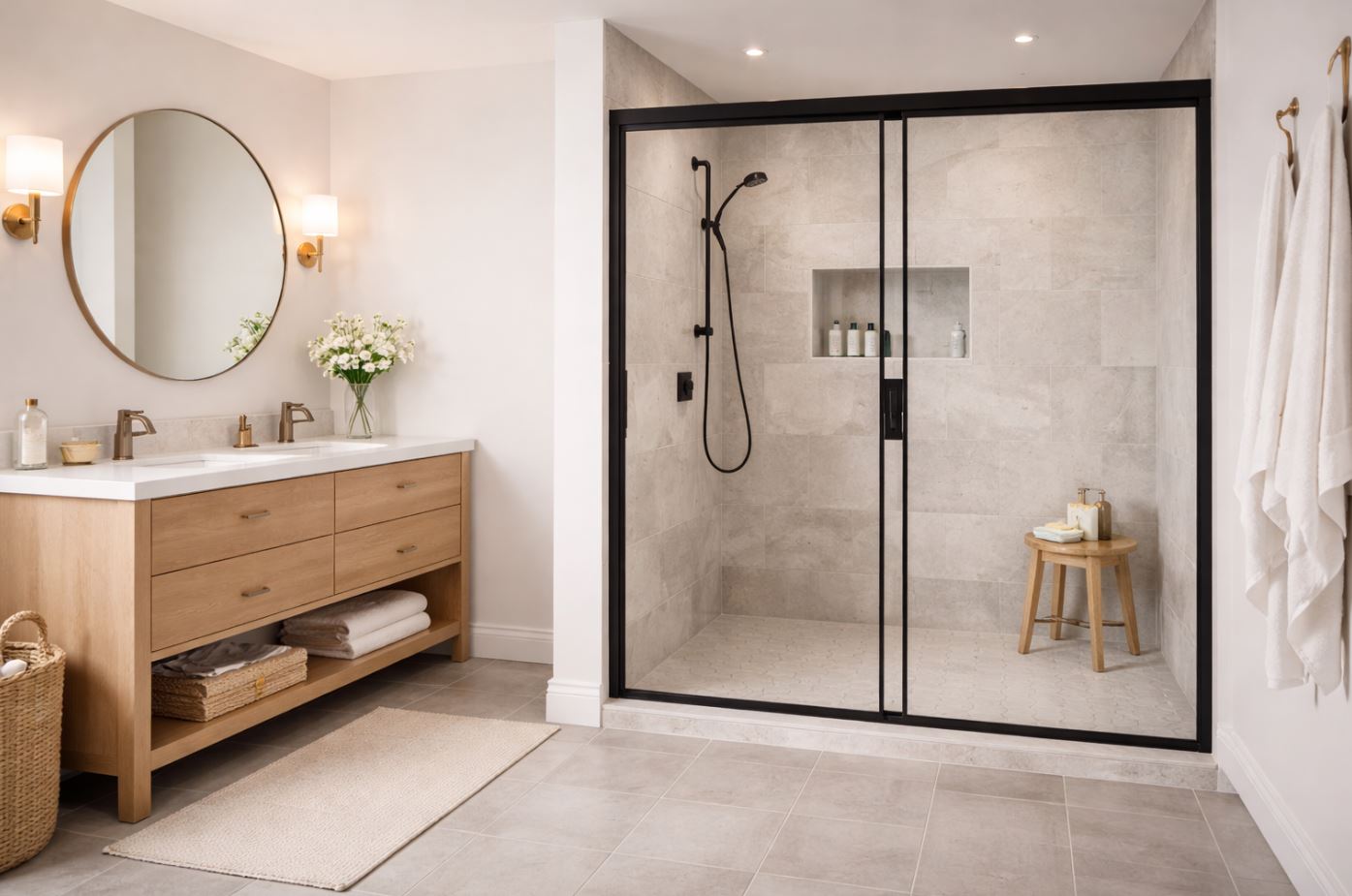 排水坡度與防水工程最重要。玻璃隔間再漂亮,若坡度不足或防水沒做好,仍會積水、滲漏與發霉。