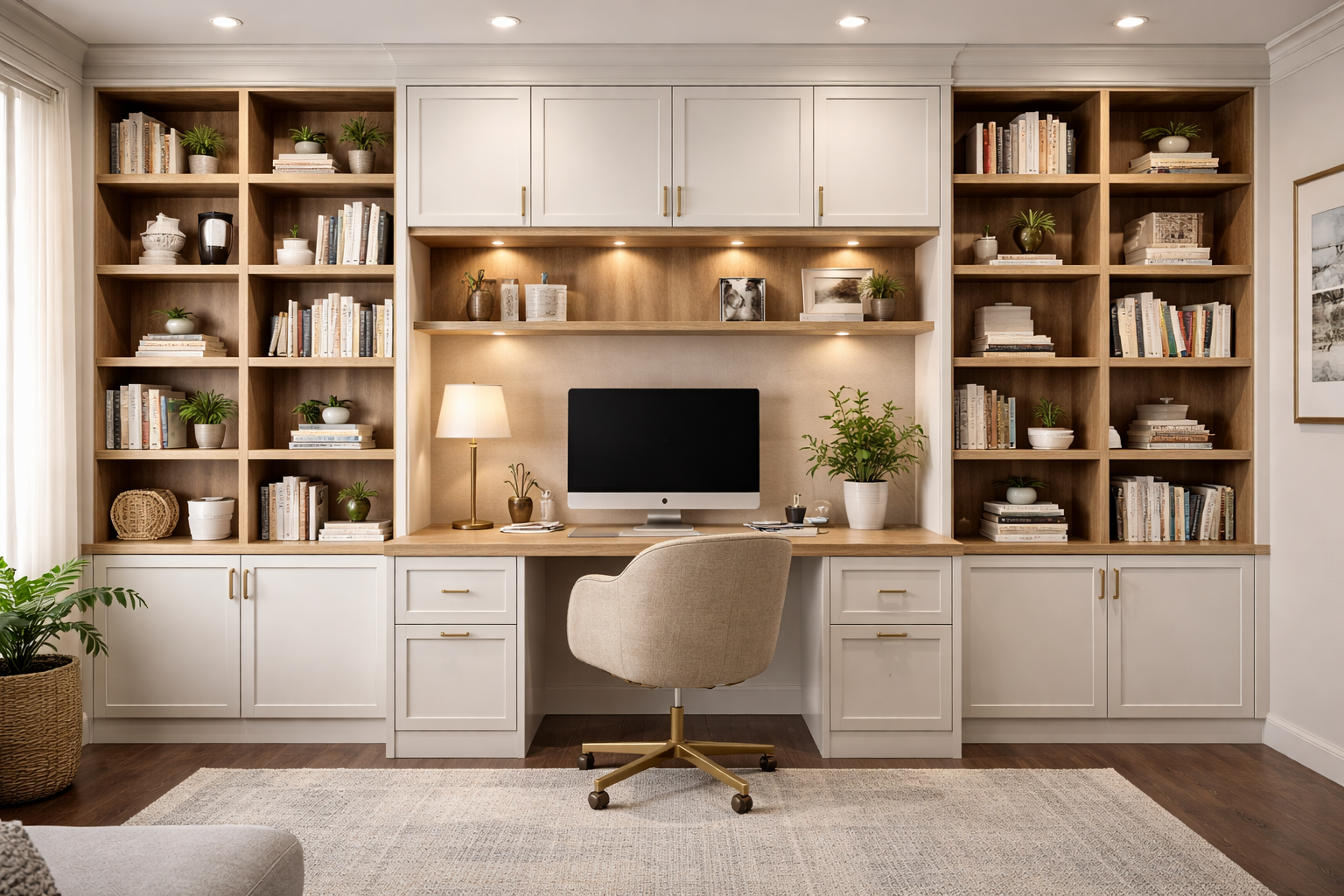 同樣一張桌,有人要雙螢幕、有 人要手作、有 人要孩子寫功課;系統櫃最大好處就是能對症設計。
