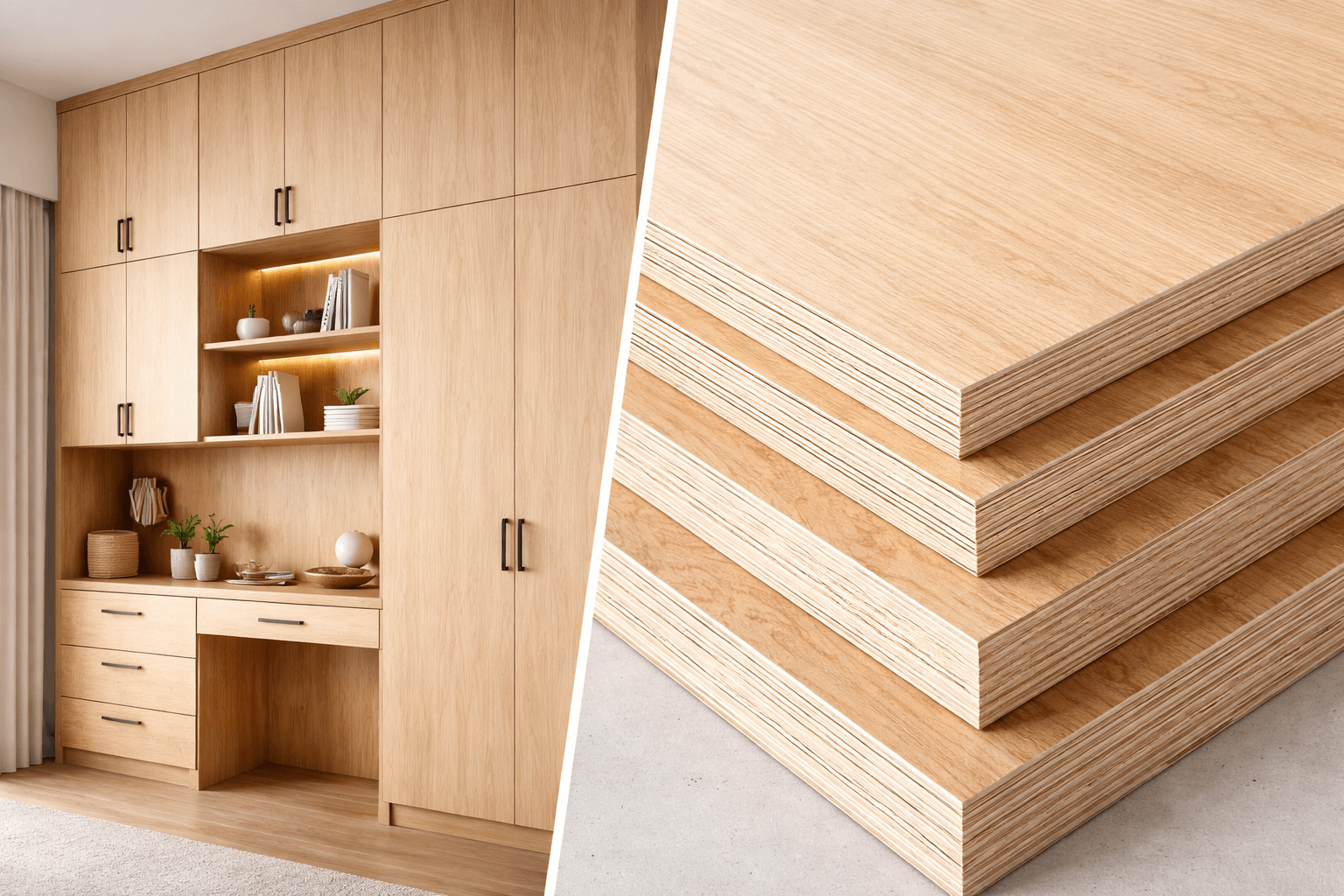 臥室收納櫃、書桌櫃體、臥榻下方收納或多功能空間整合櫃,都很適合使用穩定度較高的板材規劃。