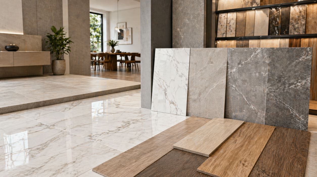 常見有拋光磚、石英磚、釉面磚、陶質磚、瓷質磚等。不同製程會影響硬度、吸水率與耐用性。