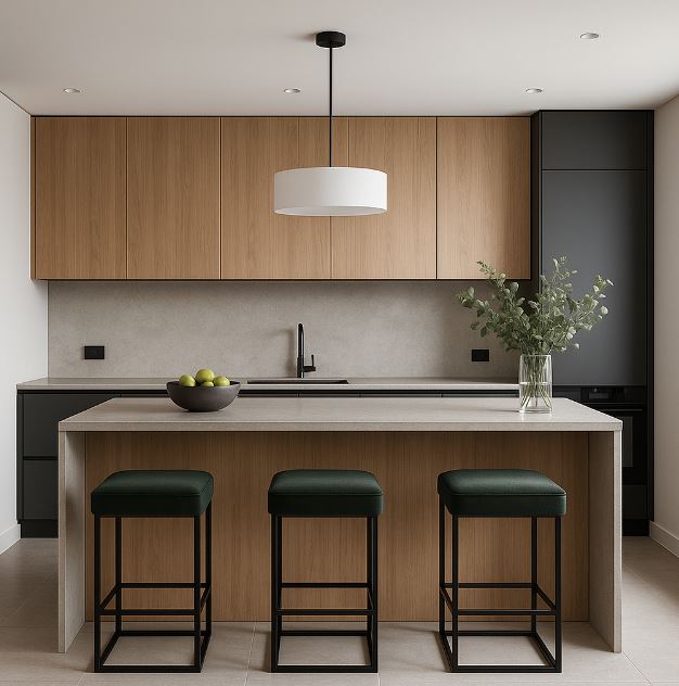 以霧面石材/礦物塗料/細木皮做層次,弱化高反光;觸感溫潤、視覺安定。