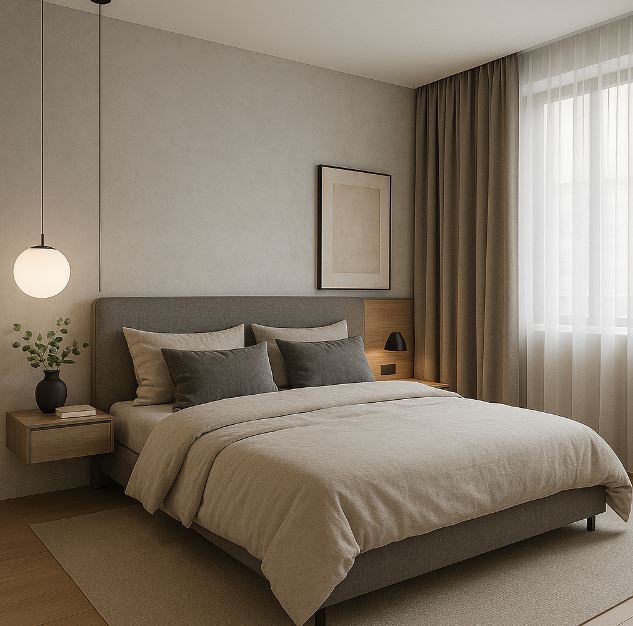 窗簾建議:日間使用 透光紗簾+遮光簾 的雙層搭配,靈活控制光線。
