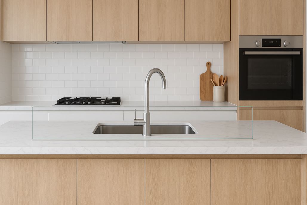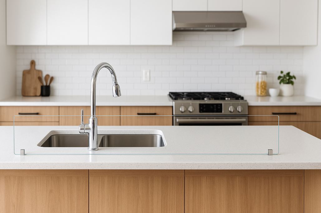 有水槽的中島,擋水板不是必裝,但多半「值得裝」。 在槽深、退縮、龍頭已把濺水源頭控制後,選擇60–120mm 中高擋水或180–300mm 透明擋水,能兼顧日常好用與視覺通透。
