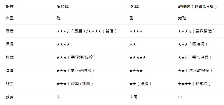 - 隔音需求較高者:120mm 砌塊或雙層牆(中間50mm岩棉)
