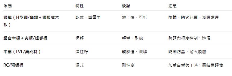 耐磨面材(木地板/石材/耐磨PVC) → 隔音墊 → 結構板(厚≥18–25mm) → 次梁/主梁 → 減振墊/防火包覆 → 錨栓入主結構。