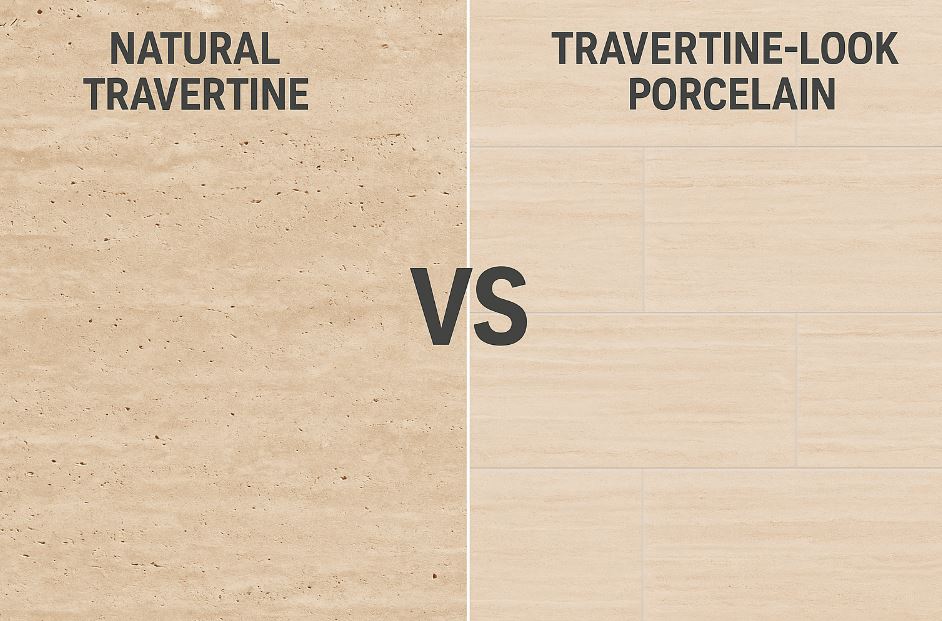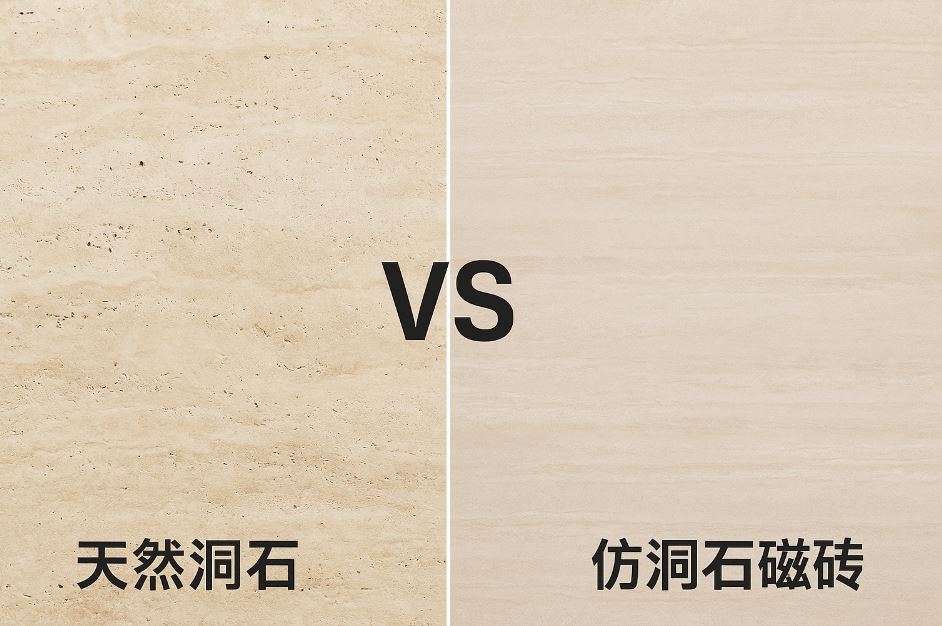 天然洞石(Travertine)以孔洞與流紋著稱,氣質溫潤、越用越有味;仿洞石磁磚則以釉面與噴墨技術重現紋理,卻具備高強度、低吸水、好清潔的優勢。