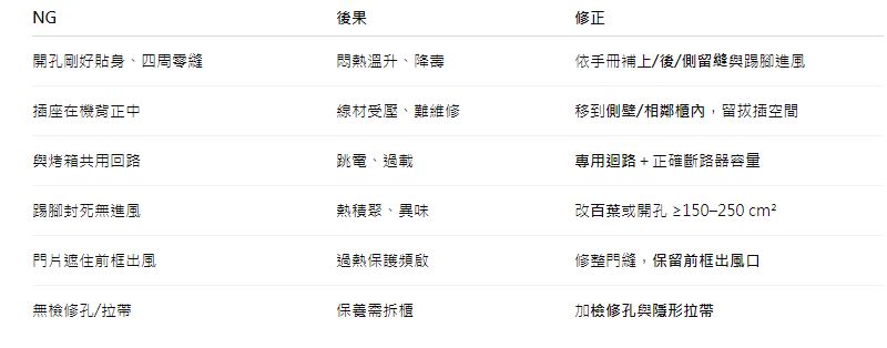微波+烤功能機種加熱強、排熱量也大;若只求齊平好看,忽略進出風通道、櫃體耐熱、電源容量,很快就會溫升警報、異味、跳電。