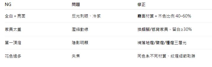 原則:避免單一頂燈;用多光源降低對比、增厚空間層次。