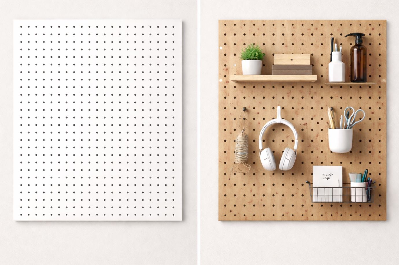 洞洞板(Pegboard):常見為木質纖維板/合板/塑材/金屬,以固定孔距為主,配件系統成熟,適合工具收納、居家展示與彈性改造。